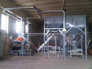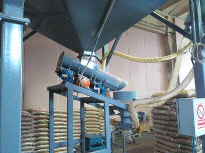 Complete wood pellet manufacturing plant, consisting of a shredder, wet silo material, hot air generator, dryer, gravity separator, grinder, dry silo material, pelletiser machine, cooler, packing machine, pallet wrapping machine with a productivity of 1500 kg / h.
